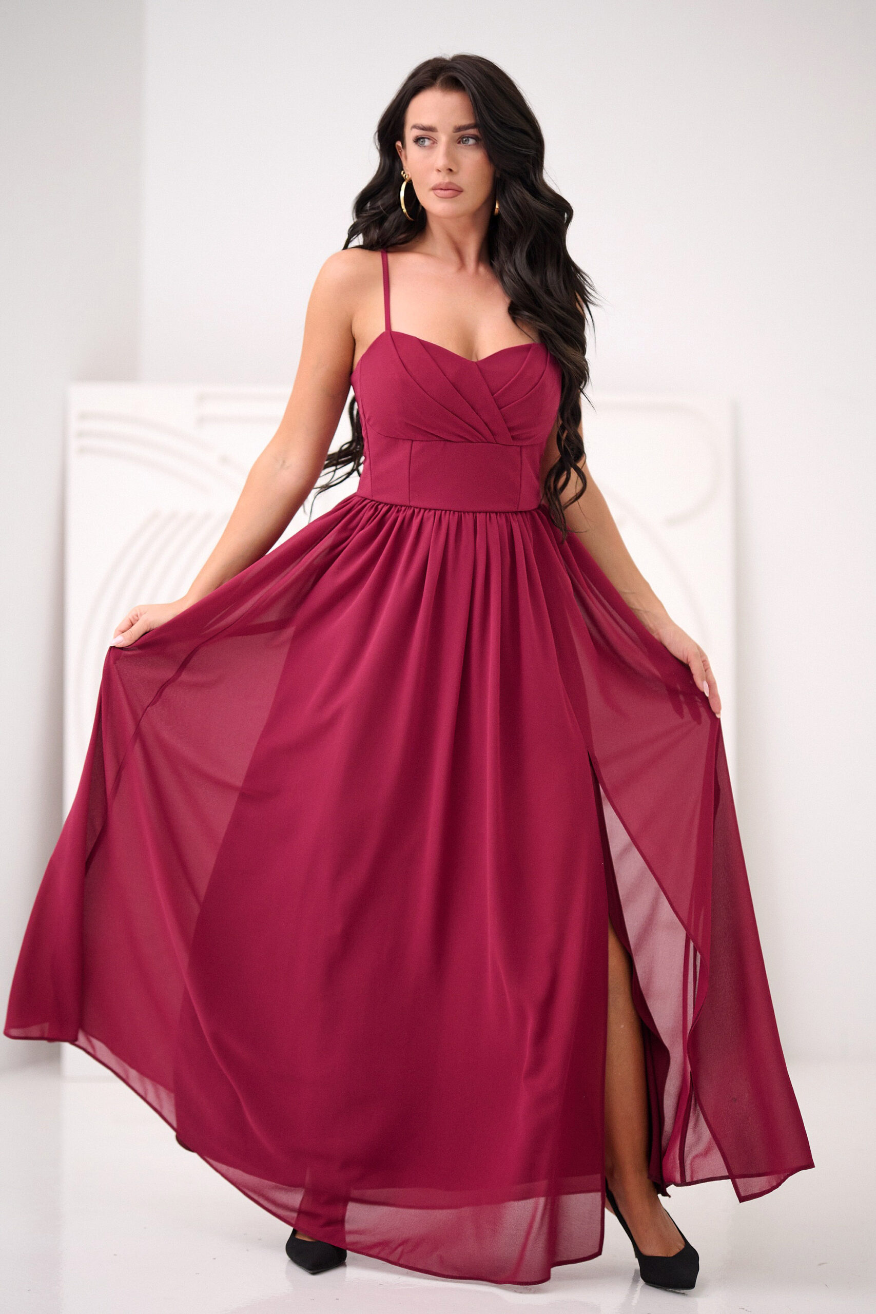 Uszyta z szyfonu z delikatnym połyskiem, pięknie układa się w ruchu i podkreśla sylwetkę. Model posiada dopasowaną górę z subtelnymi zakładkami oraz marszczony szeroki doł z rozcięciem, które dodaje zmysłowości.